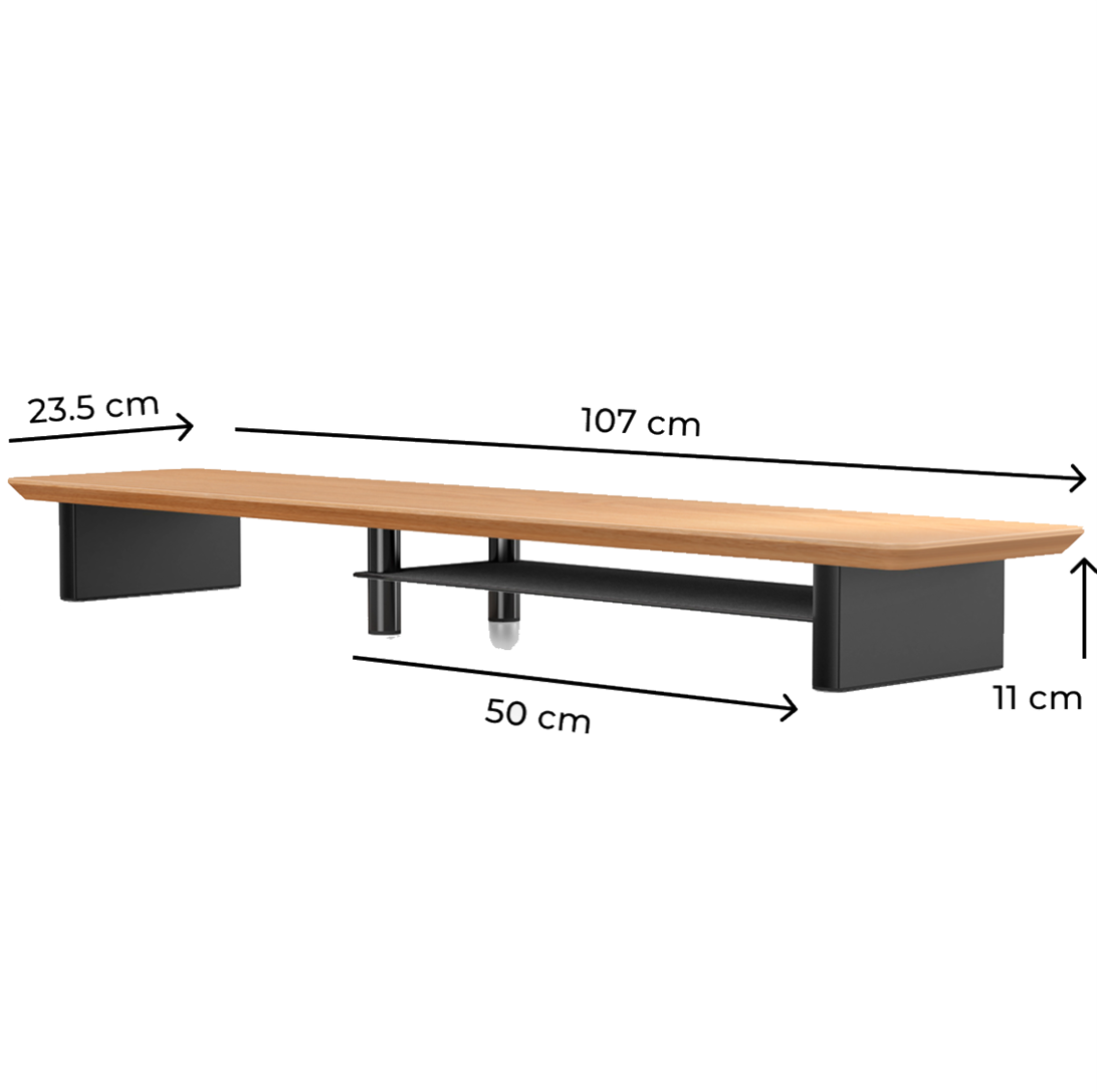 Create your ideal desk setup with the Alberenz® Oak Monitor Riser. This stylish monitor riser elevates your screen to eye level, promoting an ergonomic posture and reducing neck and back strain. With a generous 107 cm width, it easily accommodates two monitors up to 27 inches or one ultrawide monitor up to 49 inches. The open space underneath is perfect for storing your keyboard and mouse, keeping your desk tidy and organized. Thanks to its sturdy construction, it supports up to 30 kg, making it ideal for heavy monitors or multiple devices. The luxurious walnut finish adds a warm and premium touch to your desk, making work not just more comfortable, but also more stylish.