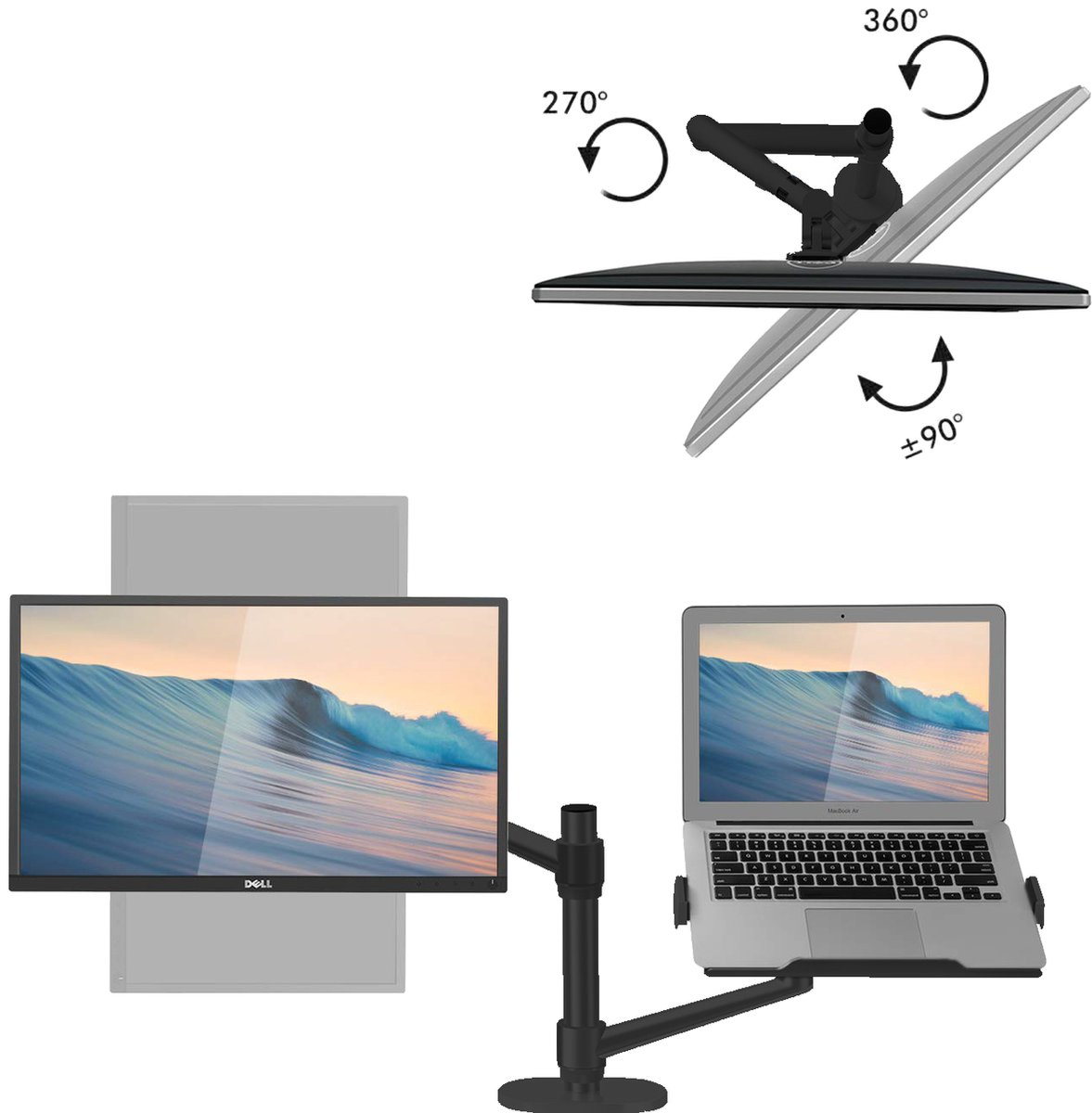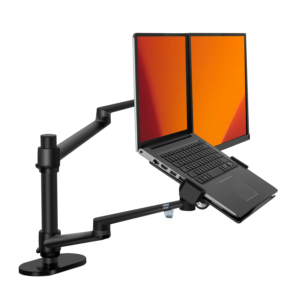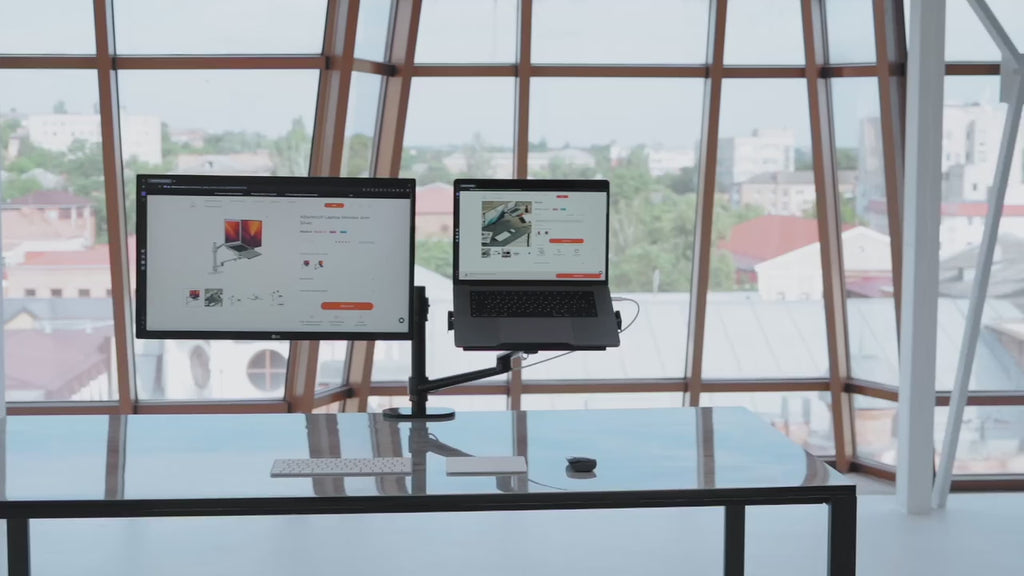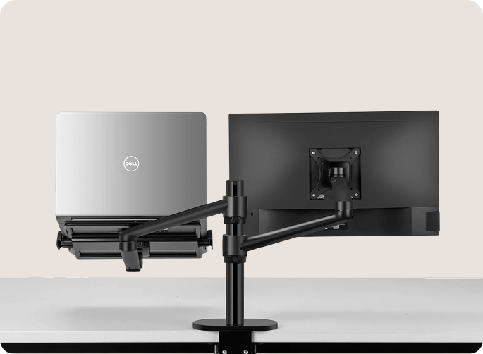 Holds both a monitor (up to 32", VESA 75×75 / 100×100) and a laptop—no separate stands needed.
